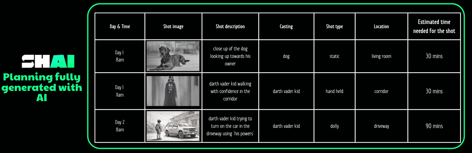 Finally, Shai AI creates an entire shooting plan, in seconds, and fully editable.