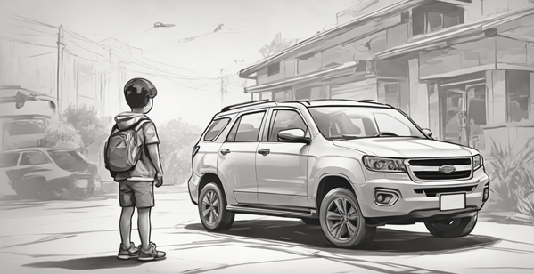 Kid standing in front of a Volkswagen passat